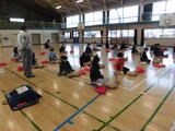 AEDの使い方では、植野小学校のAEDのある場所は「保健室」ということを確認したあと、音声ガイドの説明やパッドについて知りました。グループごとの実践では、傷病者を発見したところからAEDを取り付けるまでを行いました。一人ひとり役割をもち、協力して行うことができました。