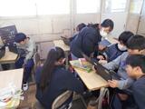 家庭科の授業では、自分たちの住む地域とどのように関わるとよいかについて学習しています。今日は、地域ごとにグループになり、それぞれの地域の特徴についてまとめました。地域ごとに違った特徴があることに気付くことができました。