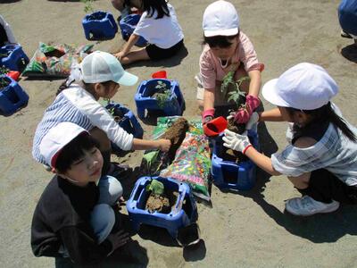 友達と協力し、植木鉢に土を入れ、上手にポットから苗を取り出し植えることができました。