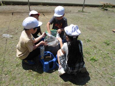 生活では、お家の方とたねを植えたあさがおのお世話を一生懸命にしています。毎日、休み時間の最初に水をあげて、観察をしてから遊び始めています。1枚目の写真は、水やりに向かって走っている様子です。「はっぱが大きくなってた!」や「きみどりが輝いているよ」など、よく観察して、教えてくれる子がたくさんいます。