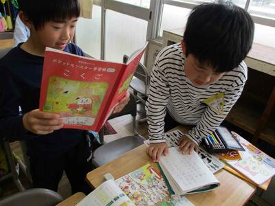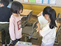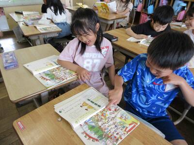 国語の「ともだちをさがそう」では、教科書の絵を見ながら探しているともだちの手がかりになることを考えました。楽しそうに探し合いをすることができました。
