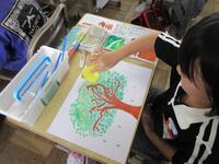 校庭にある木の中からお気に入りのものを選んで描きました。ぼこぼこしている所の形や色のちがい、枝の伸びていく方向など、さまざまな角度から木を見て描いていました。葉の描き方も工夫して描く姿が見られました。