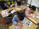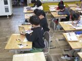 図工の版画の学習では、動物を題材にして下絵を描き、カーボン紙を使って版木に写しました。子どもたちにとって、カーボン紙を使うことは初めての経験です。下絵をなぞると、版木に写ることを驚いていました。写し終わると、いよいよ彫刻刀を使って彫り始めました。白くする所と黒くする所を考えながら、一生懸命に彫り進めていました。