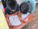 英語活動では「色」について学びました。最初にいろいろな色の英語の言い方を学び、その後は、ブラウンベアというお話で色についての学びを深めました。
