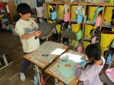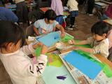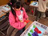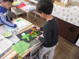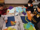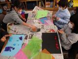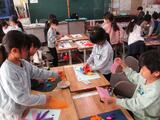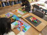 1年生は図画工作で「ふわっと ぎゅっと おはながみの え」に取り組みました。おはながみを用いた作品作りでは色だけでなく、貼り方によって作品のできが大きく変わるため、子どもたちはたくさん考え、いろいろ試しながら作品作りを進めていました。完成すると子ども同士で、「このはりかたすごいね。」や「いろのつかいかたがうまいね。」などと良いところを伝え合う姿もありました。