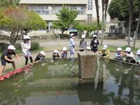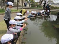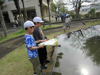 理科の学習で、温度計を使って気温や水温を測りました。この日はあたたかく、気温は20度を超えていました。また、交通公園や校庭にはタンポポなど春に咲く花が見られました。これから、植物などが季節ごとにどのように変化していくのか、1年間観察していきます。
