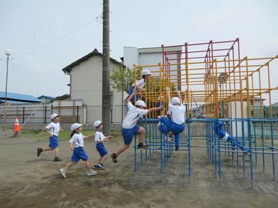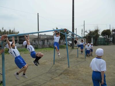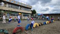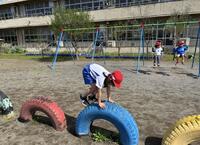 体育の時間には、遊具を使って体を動かし、「タイヤの上を跳べるようなった」「雲梯ができるようになった」とできるようになったことが増え、嬉しそうに取り組んでいます。