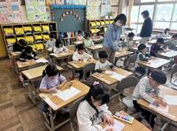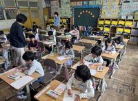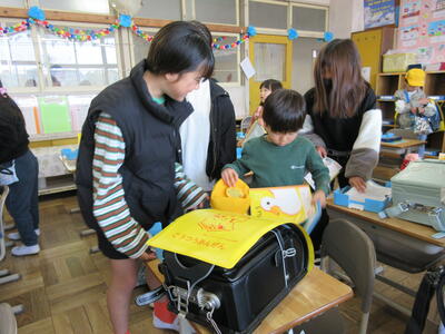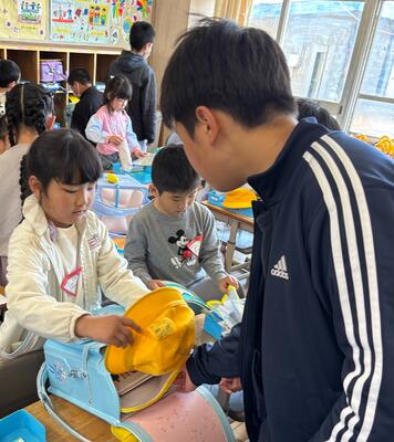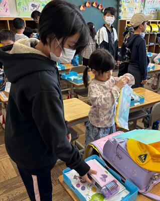 6年生が朝の準備を手伝いに1年生の教室に行っています。